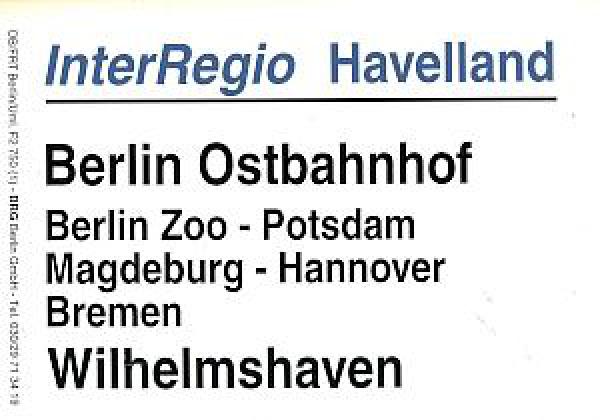 Zuglaufschild Inter Regio Havelland Berlin Ostbahnhof - Wilhelmshaven