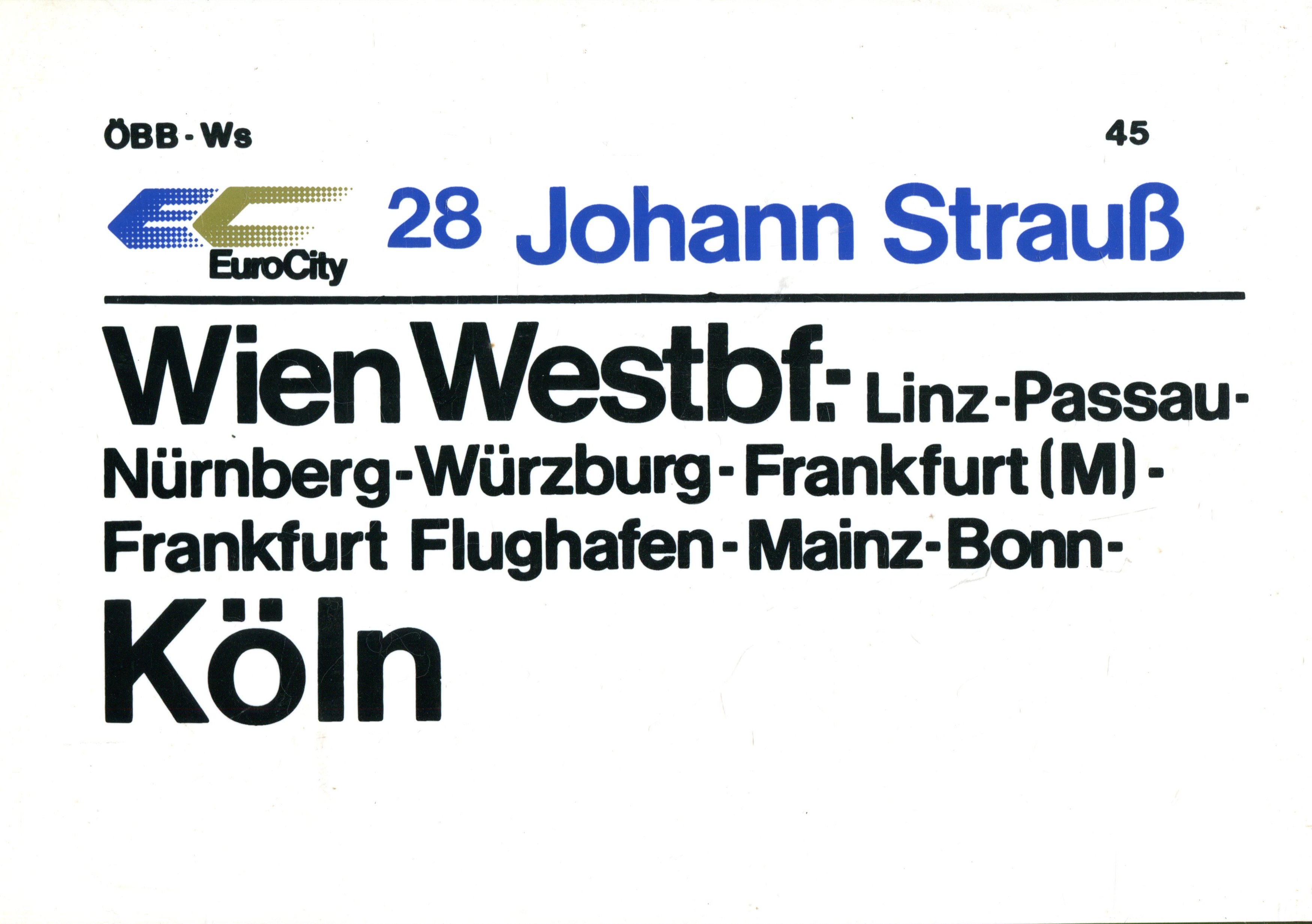 Zuglaufschild EC 28 Johann Strauß Wien Westbf – Köln