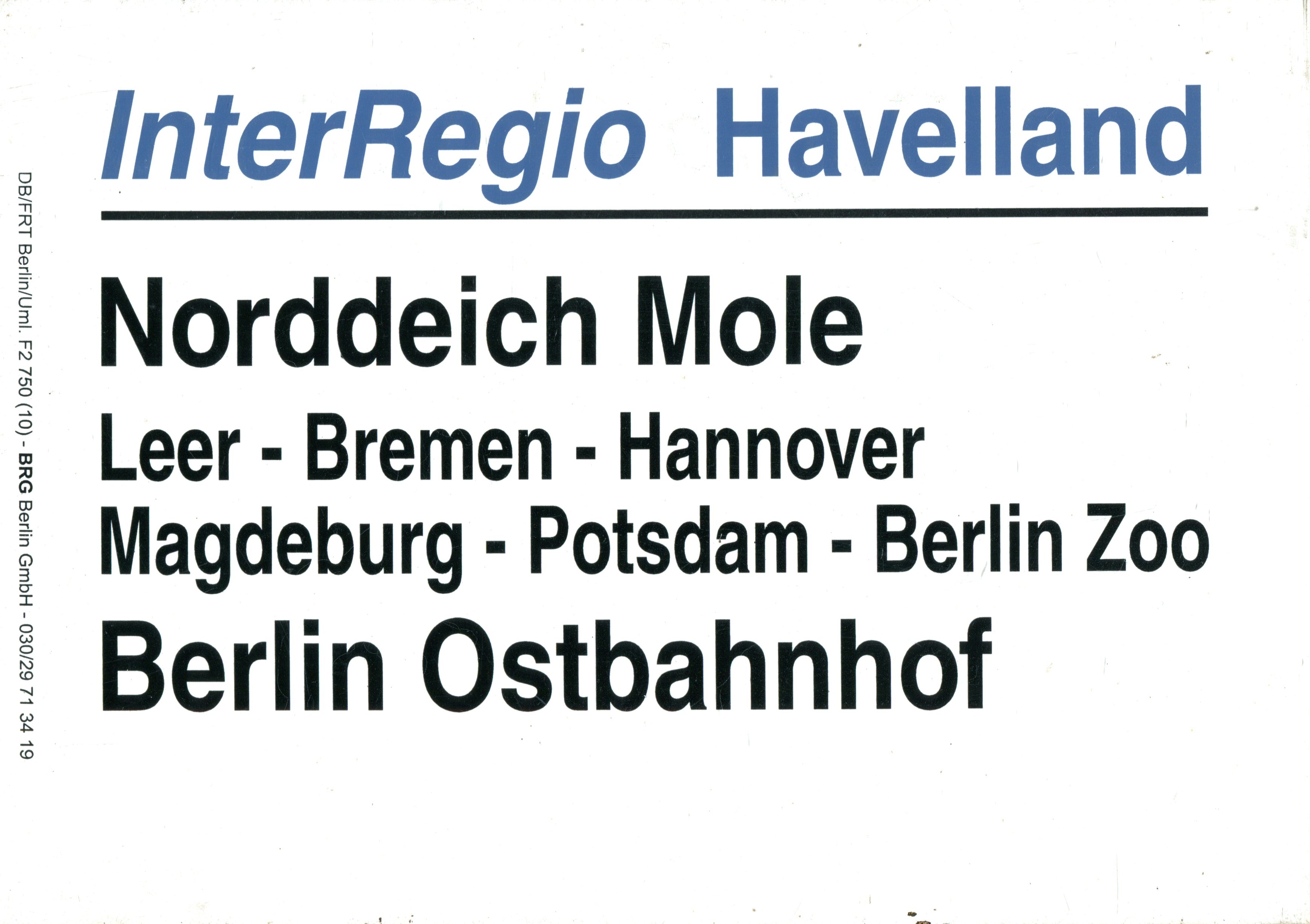 Zuglaufschild Inter Regio Havelland Norddeich Mole – Berlin Ostbahnhof