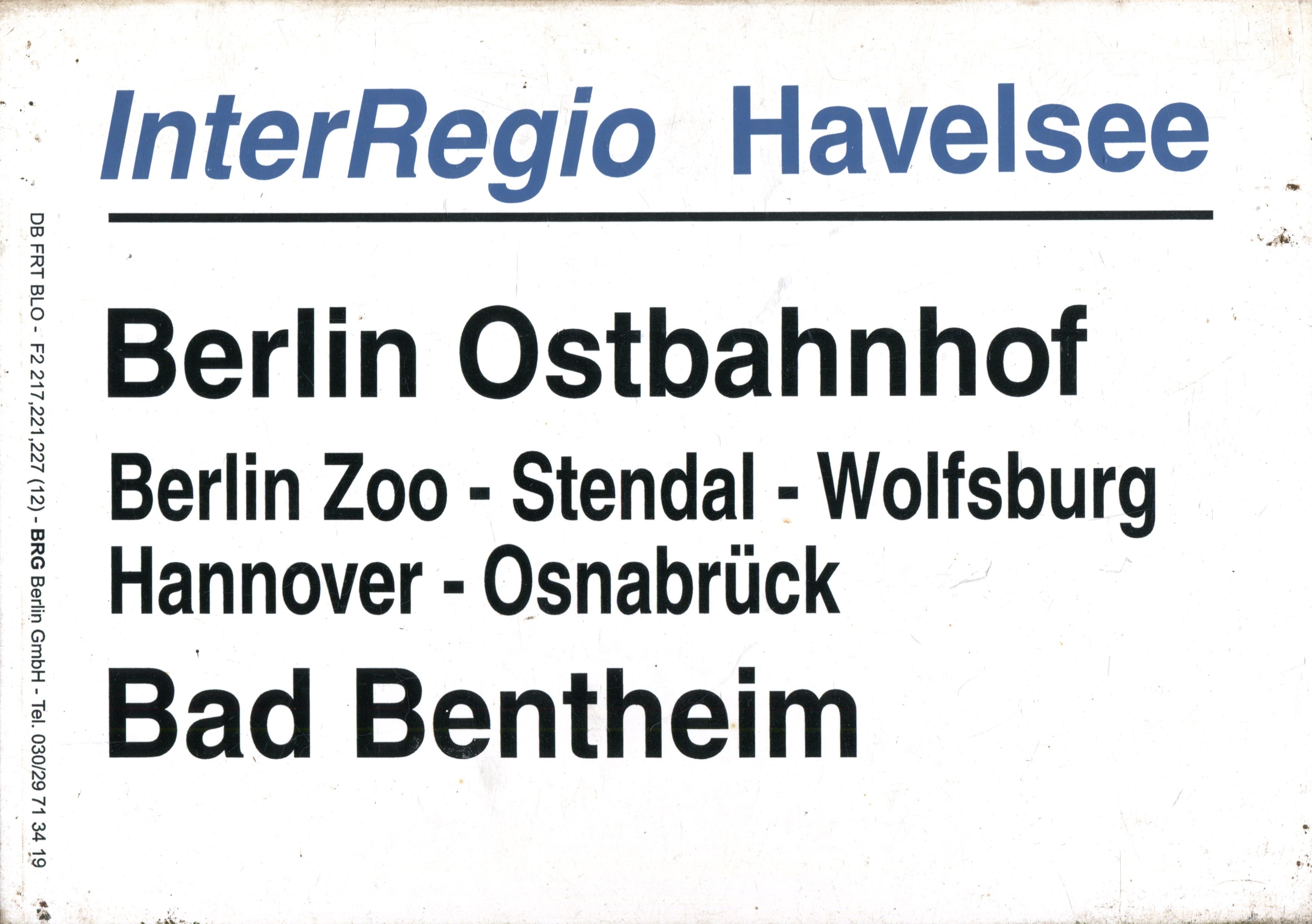 Zuglaufschild Inter Regio Havelsee Berlin Ostbahnhof – Bad Bentheim