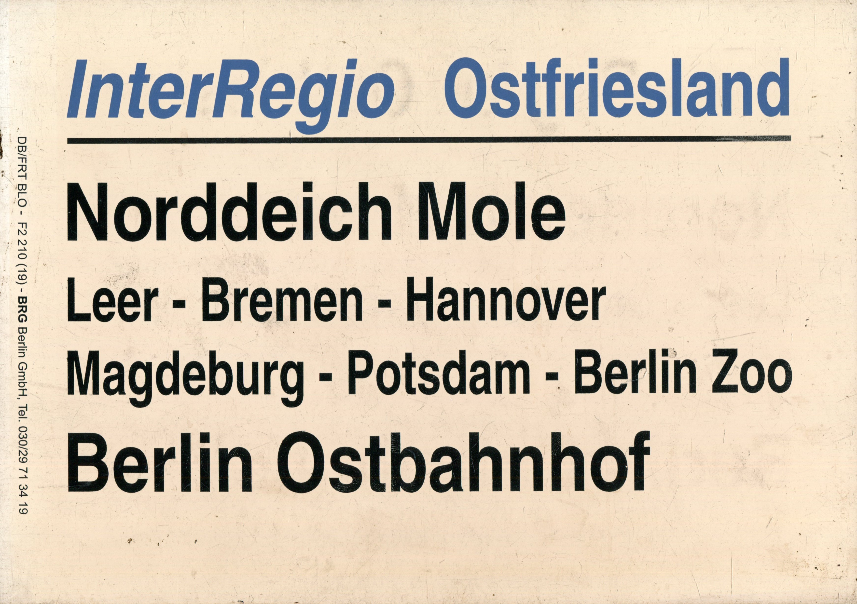 Zuglaufschild Inter Regio Ostfriesland Norddeich Mole – Berlin Ostbahnhof