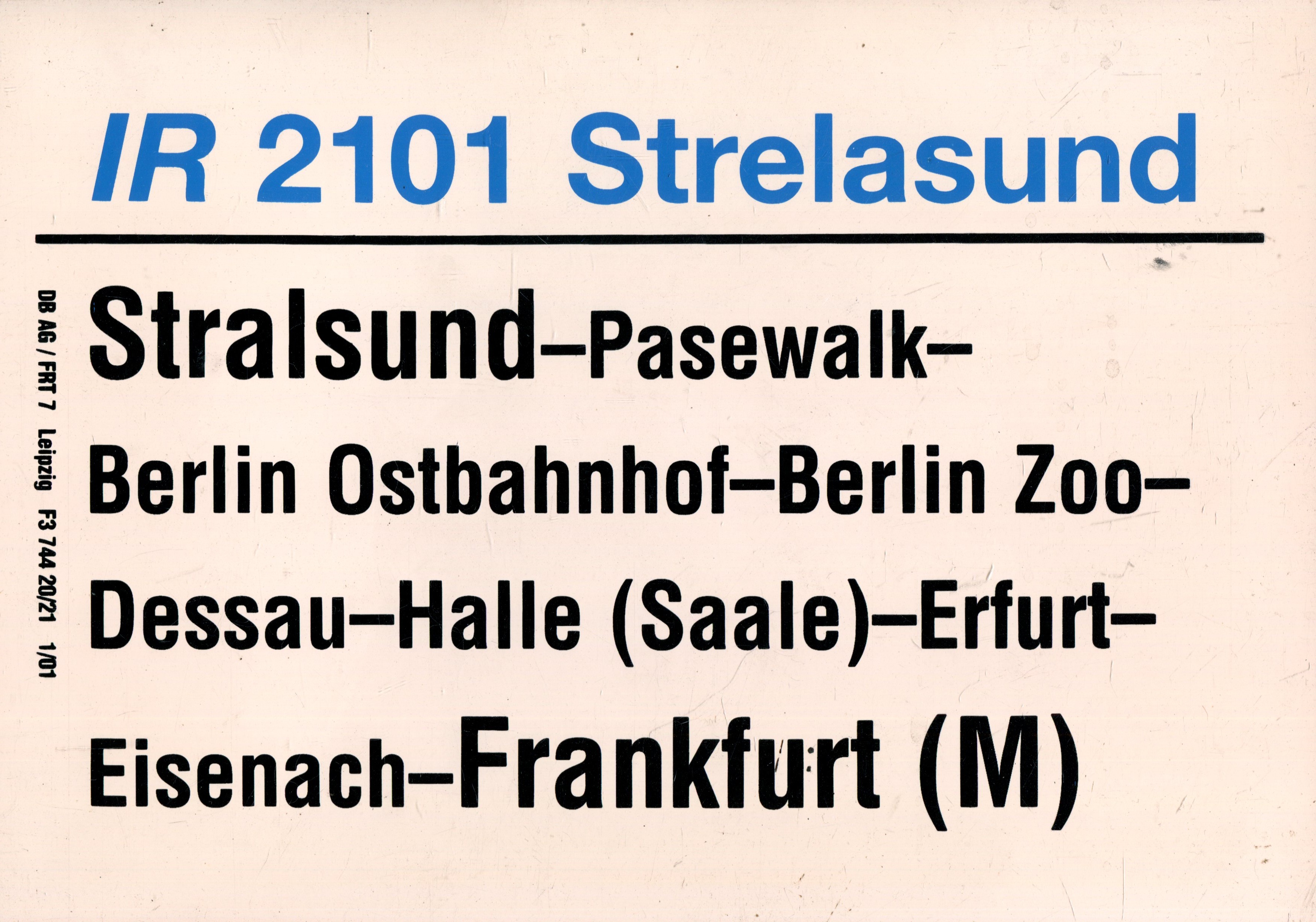 Zuglaufschild IR 2101 Strelasund Stralsund – Frankfurt / M