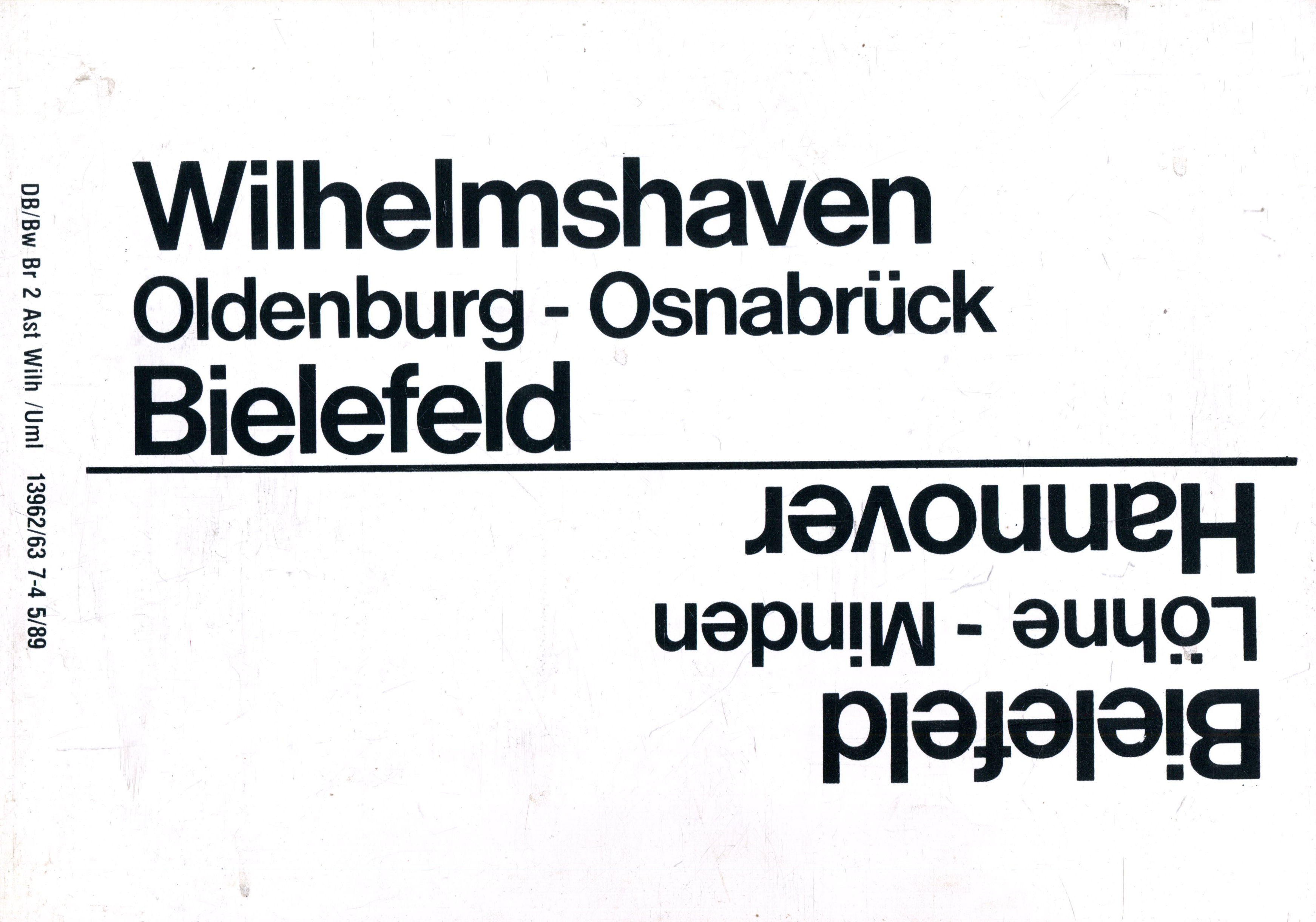 Zuglaufschild Wilhelmshaven – Bielefeld / Hannover / Rückseite Bielefeld – Altenbeken / Hannover