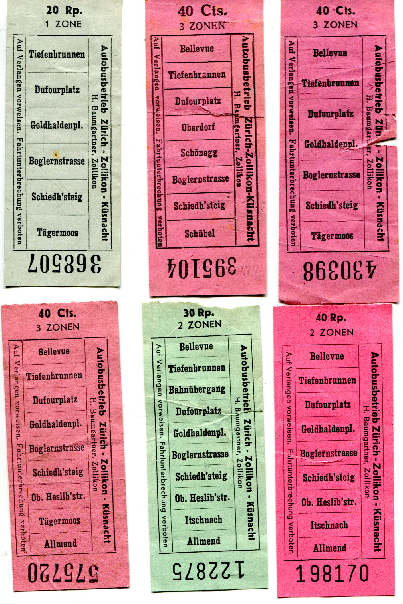 6 Fahrscheine Autobusbetrieb Zürich – Zollikon – Küssnacht