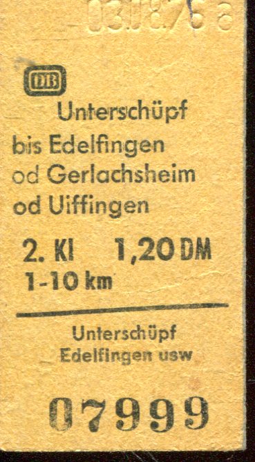 Fahrkarte Unterschüpf – Edelfingen / Uifingen 1976