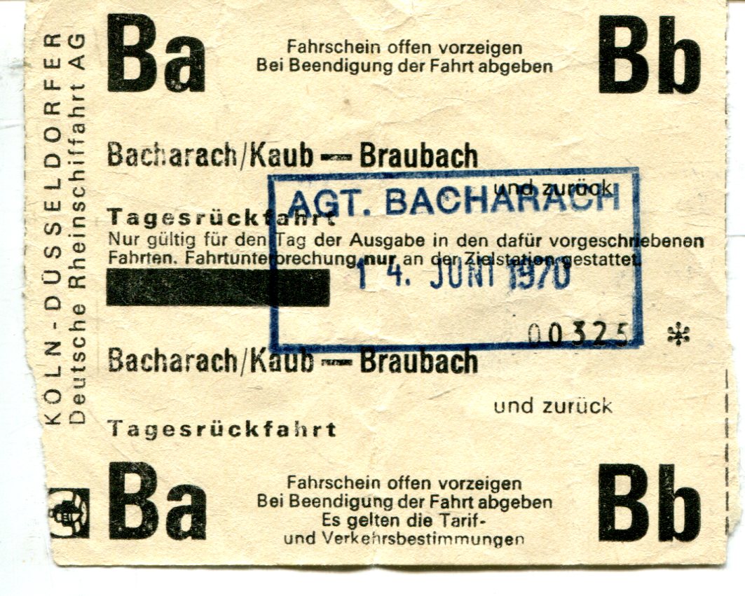 Fahrschein Köln – Düsseldorfer Rheinschiffahrt Bachcrach / Kaub – Braubach