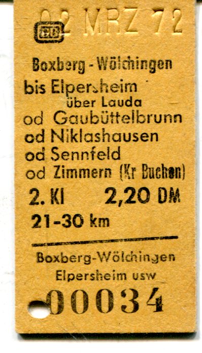 Rückfahrkarte Boxberg-Wölchingen – Sennfeld / Zimmern 1972